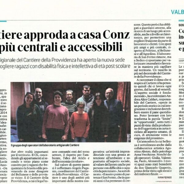 Nuova sede per Il Cartiere, il laboratorio artigianale creativo che è una delle palestre occupazionali dell’ampio progetto sociale che fa capo alla Cooperativa Cantiere della Provvidenza. Alla storica sede di San Fermo, dove viene materialmente realizzata la carta, ora si affiancano i laboratori ricavati negli spazi messi a disposizione dall’Associazione Giovanni Conz Onlus a Sedico.