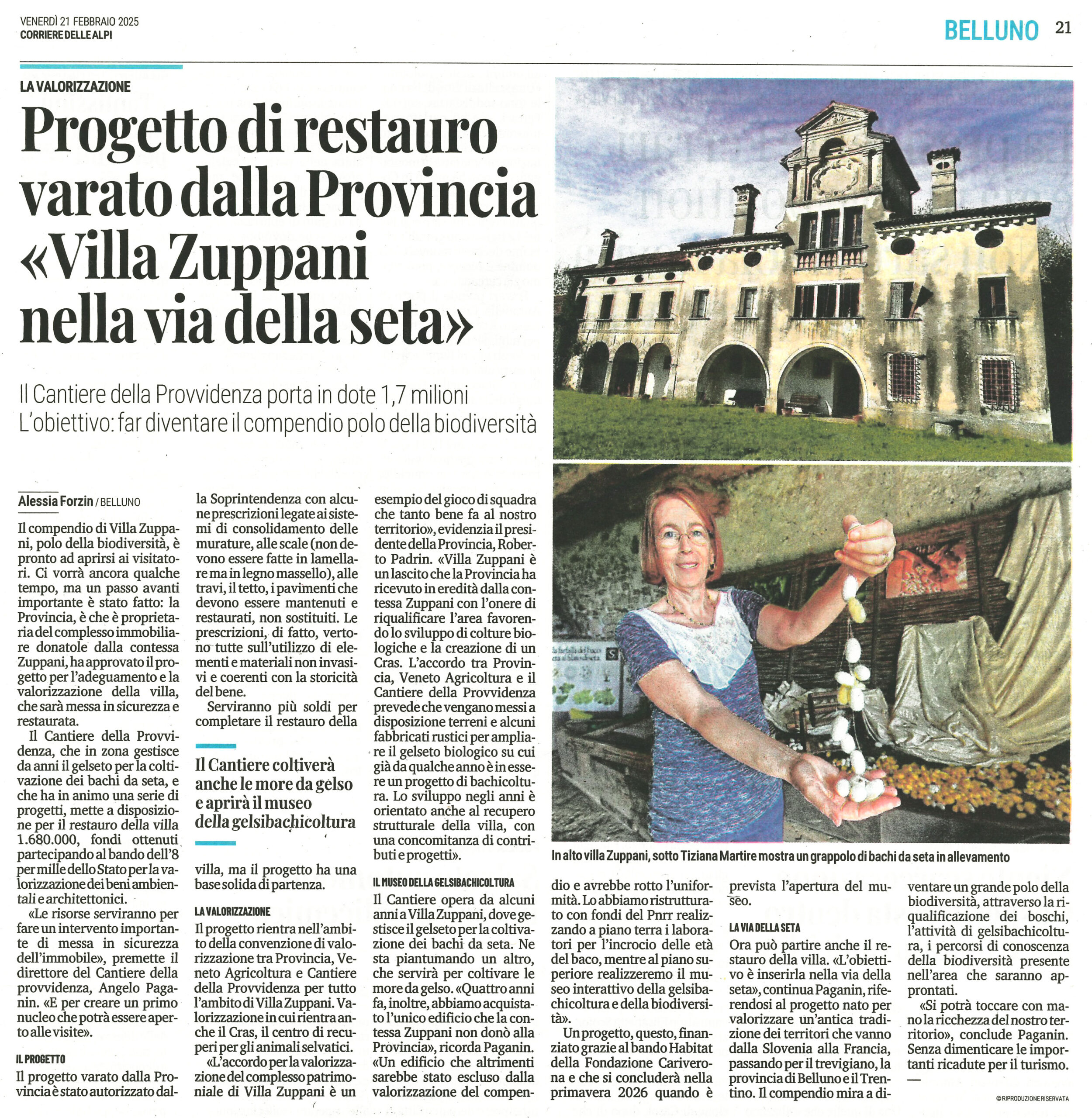 Il Cantiere della Provvidenza, che in zona gestisce da anni il gelseto per la coltivazione dei bachi da seta, e che ha in animo una serie di progetti, mette a disposizione per il restauro della villa € 1.680.000, fondi ottenuti, partecipando al bando dell’8 per mille dello Stato per la valorizzazione dei beni ambientali e architettonici…
