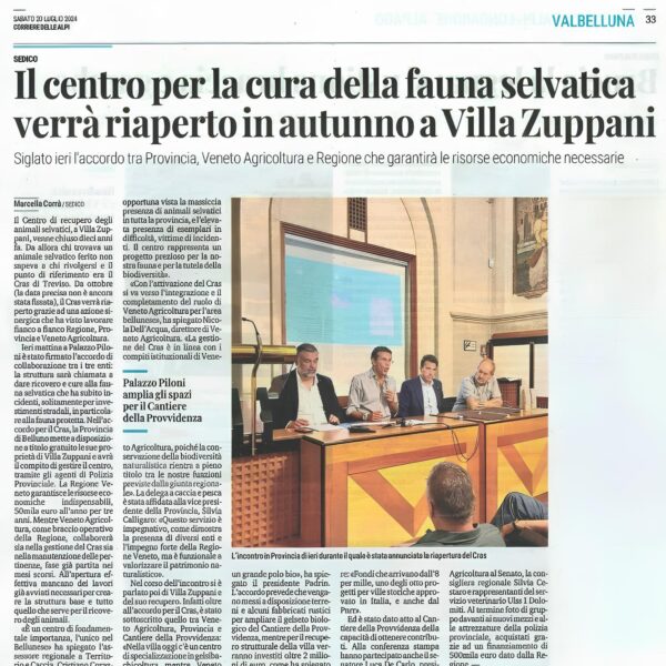 «Con grande soddisfazione annunciamo la riapertura del Centro di recupero della fauna selvatica di Sedico a Belluno. Un centro di fondamentale importanza, l’unico nel Bellunese» commenta l’assessore regionale a Territorio e Caccia, Cristiano Corazzari. «Questa attivazione, prevista entro la fine dell’anno, è opportuna vista la massiccia presenza di animali selvatici in tutta la provincia, e l’elevata presenza di esemplari in difficoltà, vittime di incidenti. Il centro sarà ospitato negli spazi di Villa Zuppani di proprietà della Provincia, e sarà un progetto prezioso per la nostra fauna e per la tutela della biodiversità».